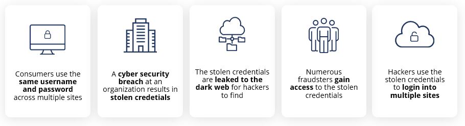 The figure below explains how malicious actors launch credential stuffing attacks. These attacks take advantage of the fact that most people commonly reuse the same password across multiple websites. This means that if an individual’s username (or email) and password combination leaks online from a data breach, malicious actors can use that information to try and login into many different websites.