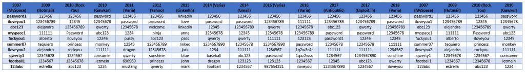 Over the last 10 years, 14 studies have analyzed leaks of password databases. The table below shows the evolution of the TOP 10 most common passwords found in those leaks.