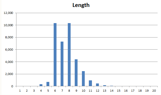Passwords tend to be fairly short. Most passwords are between 6 and 10 characters long as shown above in Troy Hunt’s analysis. Other analyses show passwords as long as 225 characters but these represent less than 0.01% of all passwords.