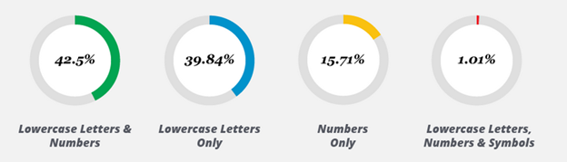 In addition to being short, most passwords are either composed of numbers only, lowercase letters only or a mix of both. About 1% of passwords follow the best practice of also mixing in symbols. Combined, password length and composition explain why security researchers (or hackers) can usually decrypt over 80% of leaked encrypted passwords.