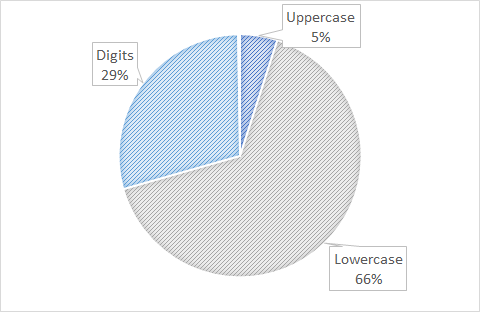 Fraudsters’ passwords contain a majority (66% of password characters on average) of lowercase letters. They also contain many digits but very few uppercase characters. Passwords contain on average no special characters.