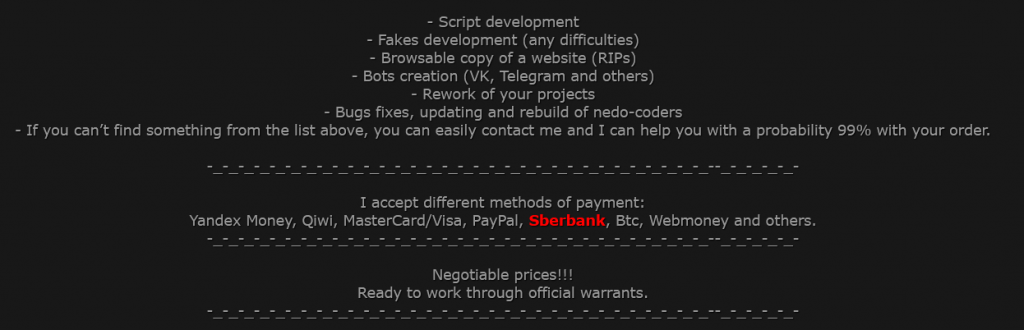 While we did find evidence that Russian banks were targeted and abused by malicious actors in North America, we also found, yet again, that Russian banks were used to receive payments for illicit services. Therefore, they were very much part of the problem. In the posting below, detected on a popular criminal forum, the largest Russian bank is mentioned in bold and red (no emphasis on our part), even before bitcoins.