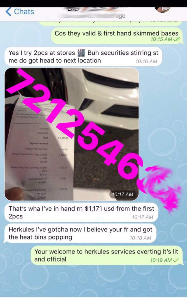 In the Figure above, a customer says that he first tried 2 stolen cards in a store but decided against it because of the store’s security. He later tried the cards at another store and got over US$1,100. He can be seen in the last message praising the vendor Herkules.